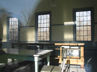1967 The Town of Somers gave the Town Hall to Hawthorn Hollow and paid for moving it. Still on oak beams – 36-foot white oak beams hewn by hand – the Somers Town Hall was lifted off of its brick piers (bricks for the piers came from brickyards on North Main Street in Racine. These brick piers were a departure from the previous standard of fieldstone foundations) onto a large dolly and hauled 2.5 miles on a side road to the back entrance of Hawthorn Hollow and set on a new cement block foundation. After 108 years and this big moving job there was not one crack in the plaster, so perfectly had all the parts of the building been aligned. The building still has some of the original 1858 window panes.